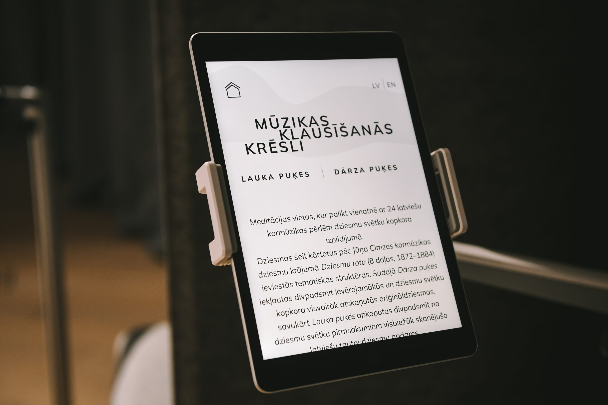 Kormūzikas klausīšanās krēslos apmeklētāji var iepazīt divdesmit četras dziesmu svētku vēsturē visvairāk atskaņotās kora dziesmas. Iedvesmojoties no latviešu profesionālās mūzikas celmlauža Jāņa Cimzes kordziesmu krājuma “Dziesmu rota”, veidotas divas kordziesmu izlases. 12 latviešu komponistu tautasdziesmu apdares apkopotas izlasē “Lauku puķes”, bet izlasē “Dārza puķes” – 12 oriģināldziesmas.